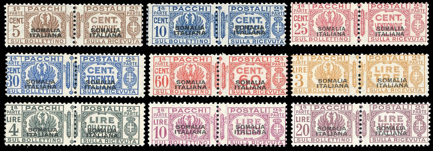 PACCHI POSTALI 1928/41 - Fasci al centro, soprastampa del I tipo, serietta di 9 valori (54/57,59,62/65), gomma originale integra, perfetti. Ferrario.