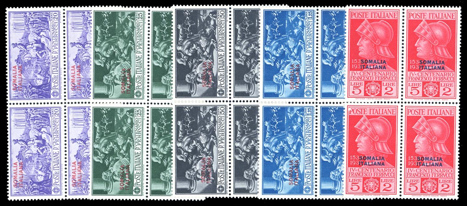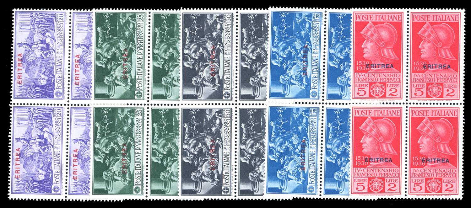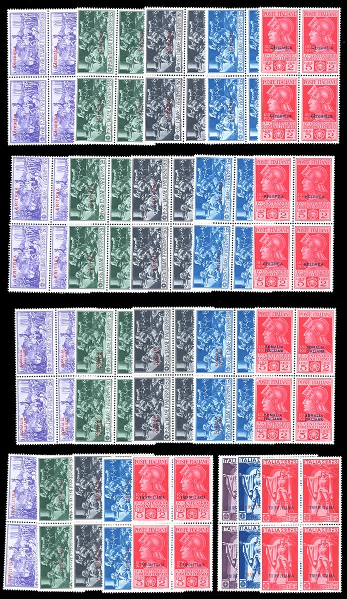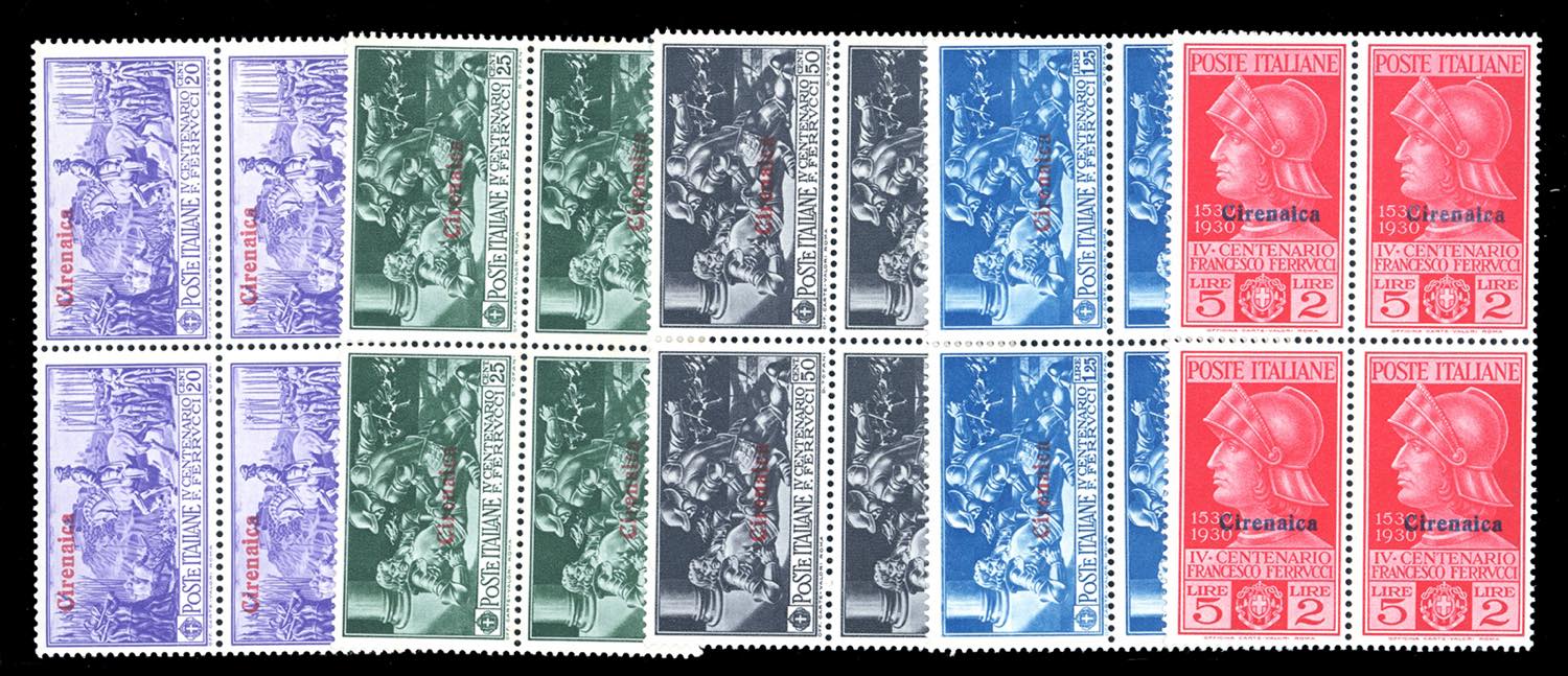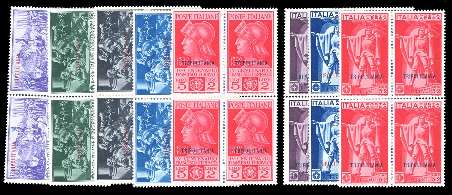 1930 - Ferrucci, serie complete, giro completo delle quattro Colonie (Tripolitania con posta aerea), blocchi di quattro, gomma originale ... Leggi tutto