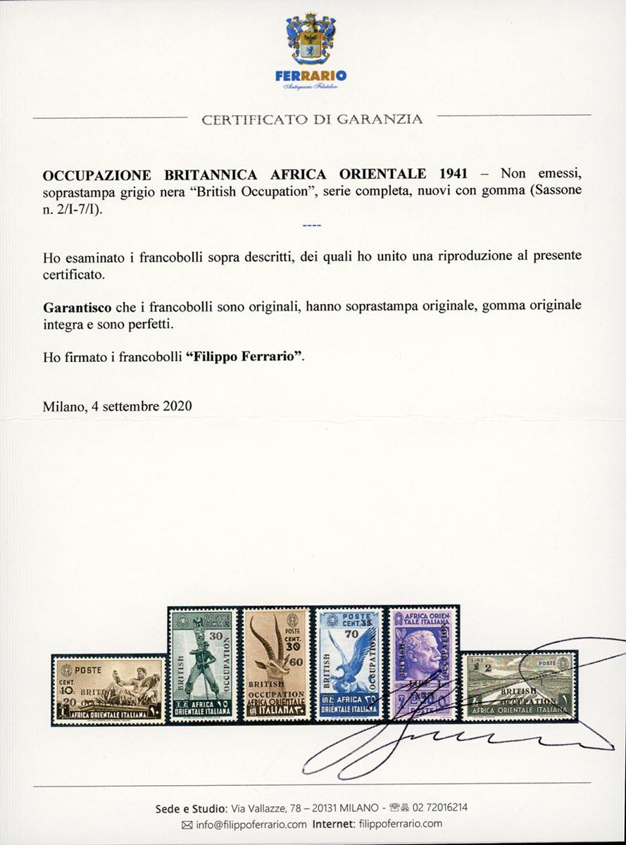OCCUPAZIONE BRITANNICA AFRICA ORIENTALE 1941 - Soprastampata grigio nera, non emessi, serie completa (2/I-7/I), gomma originale integra, perfetti. Molto belli. Cert. Oro Raybaudi, Sorani e Ferrario.