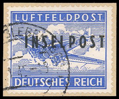 OCCUPAZIONE TEDESCA EGEO 1944 - Inselpost azzurro, emissione di Rodi, dent. 13 3/4 (4), perfetto, usato su piccolo frammento. Molto raro. Cert. Oro Raybaudi. e Petry.