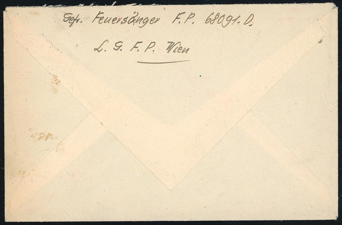 OCCUPAZIONE TEDESCA EGEO 1945 - Inselpost, soprastampa di Agram (5ea), soprastampa fortemente spostata, "a cavallo", e tratto tipografico dopo la "T", su busta dalla Feldpost "h", marzo 1945 per la Germania. Combinazione di varietà non catalogata dal Sassone. Molto rara. Ferrario.