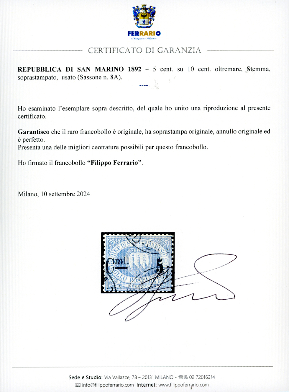 1892 - 5 cent. su 10 cent. OLTREMARE, Stemma (8A), usato, perfetto. Molto fresco ed estremamente raro di questa centratura. Tiratura 150 esemplari. A.Diena, cert. Ferrario.