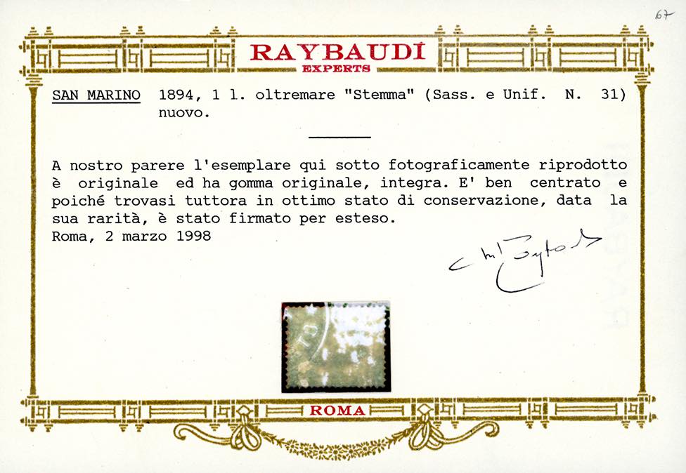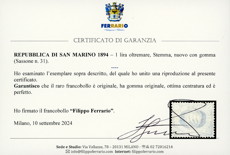 1894 - 1 lira oltremare Stemma (31), centratura eccezionale, gomma originale integra, perfetto. Splendido, qualità lusso, raro in questa condizioni. Em.Diena, cert. Oro Raybaudi e Ferrario.