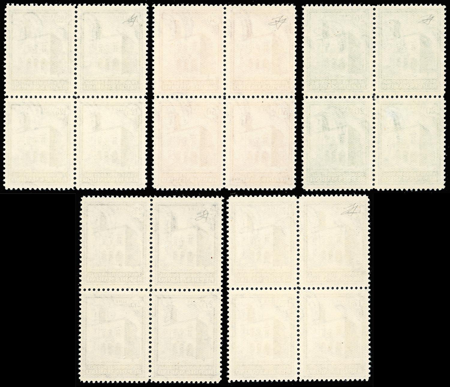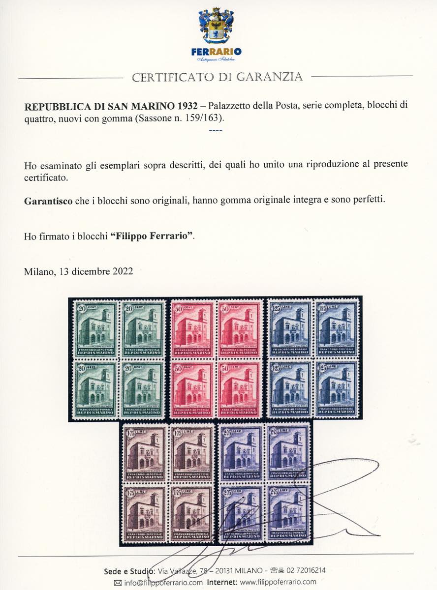 1932 - Palazzetto della Posta, serie completa (159/163), blocchi di quattro, gomma originale integra, perfetti e di ottima qualità. ... Leggi tutto