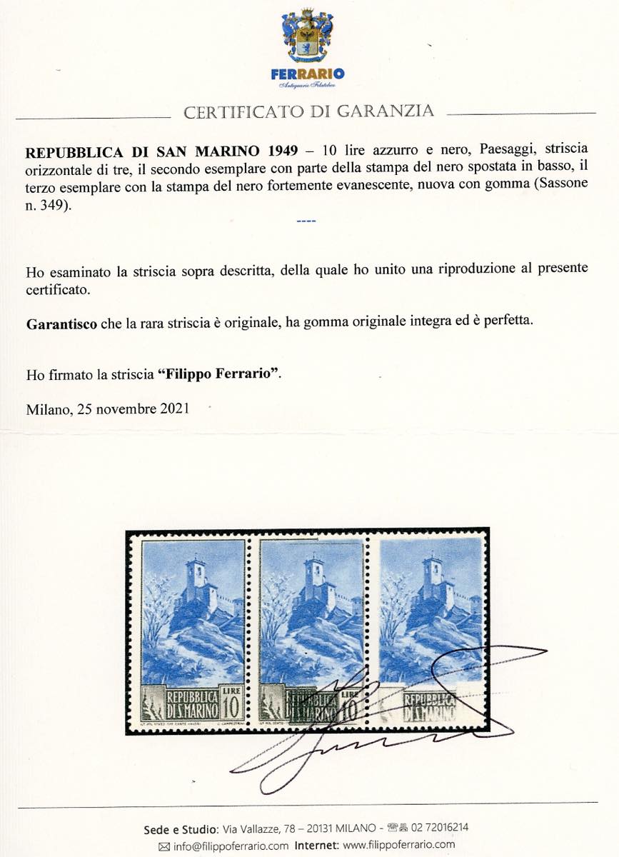 1949 - 10 lire Paesaggi (349), striscia orizzontale di tre, il secondo esemplare con parte della stampa del nero spostata in basso, il terzo con la stampa del nero fortemente evanescente, gomma originale integra, perfetta. Molto rara e non catalogata. E.Diena, cert. Ferrario.