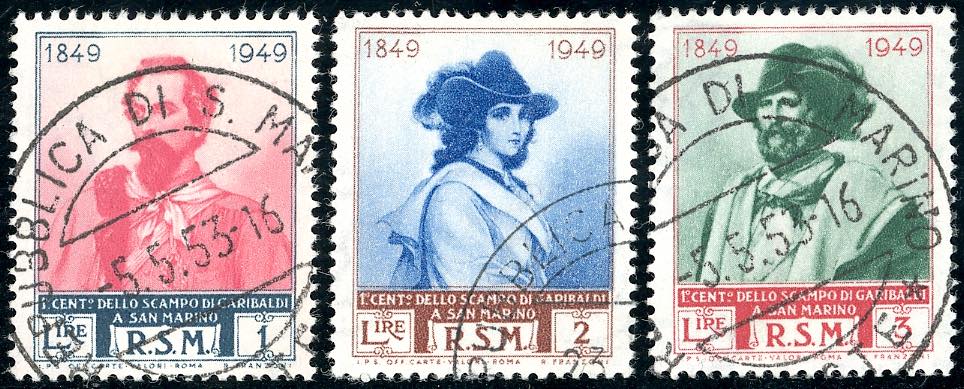 1949 - 1 lira, 2 lire, 3 lire Garibaldi, filigrana ruota III tipo (358/I-360/I), usati, perfetti. Rari. Cert. Ferrario.
