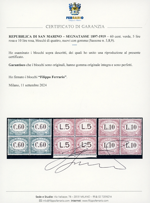 1897/1919 - Prima emissione, serie completa (1/9), blocchi di quattro, gomma originale integra, perfetti e di ottima qualità. Belli e rari. Cert. Ferrario per gli alti valori.