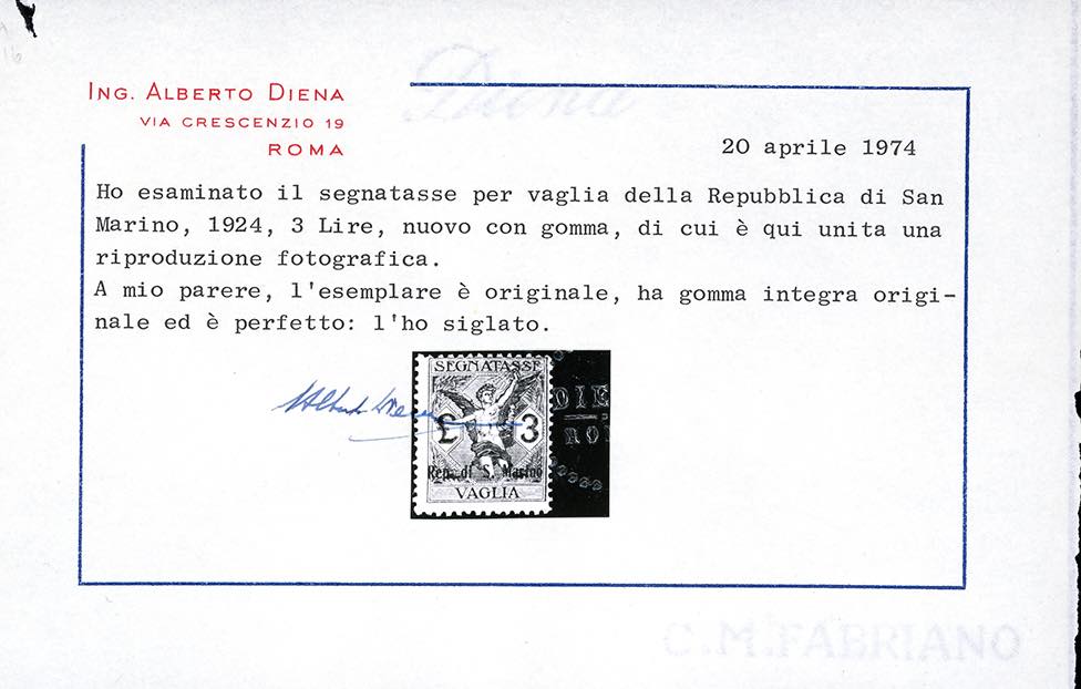 1924 - Serie completa (1/6), gomma originale integra, perfetti. Rari. Tutti firmati A.Diena, cert. A. ed E.Diena, per il 3 lire. Ex coll. Romano.