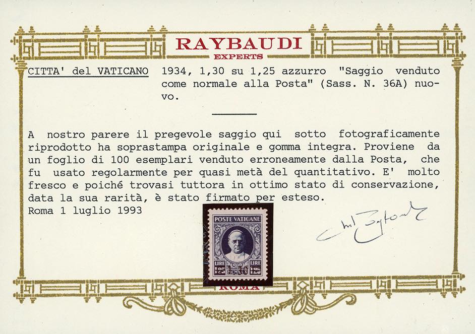 1934 - 1,30 su 1,25 lire azzurro, soprastampato della serie Provvisoria, SAGGIO VENDUTO COME NORMALE ALLA POSTA (36A), nuovo, gomma originale integra, perfetto. Splendido e molto raro di questa qualità. Tiratura 100 esemplari, di cui molti usati o linguellati. Cert. Oro Raybaudi e Ferrario.