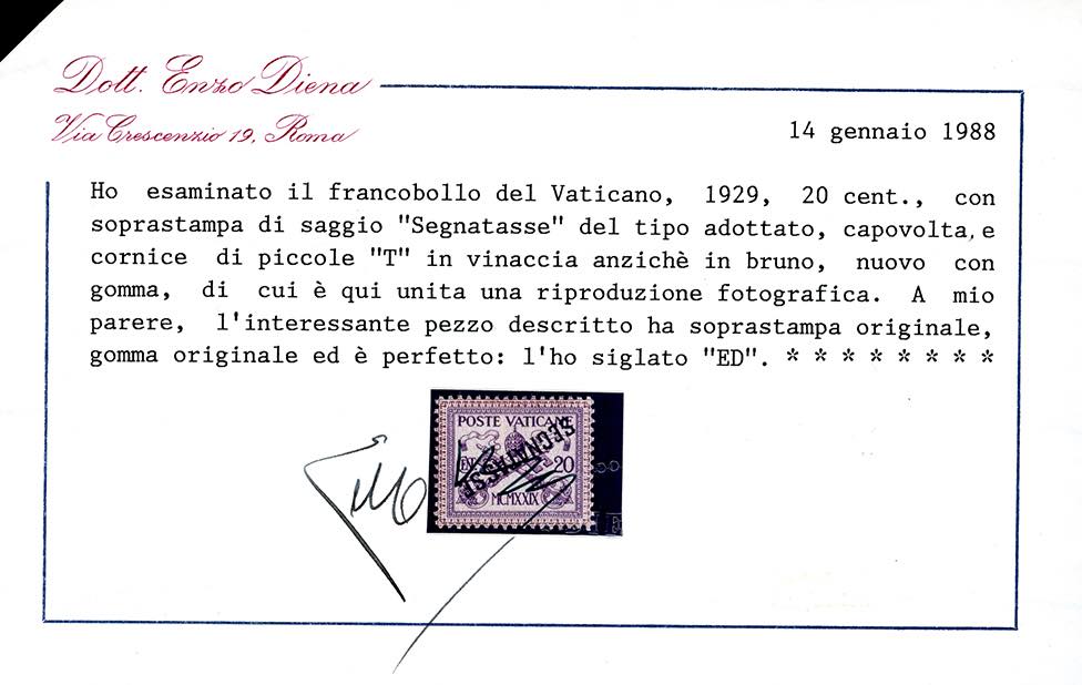1929 - 20 cent., soprastampa "segnatasse capovolta", cornice di piccole "T" in vinaccia anziché bruno, saggio (P8), gomma originale, perfetto. UNICO ESEMPLARE NOTO, rarità del settore. Cert. E.Diena.