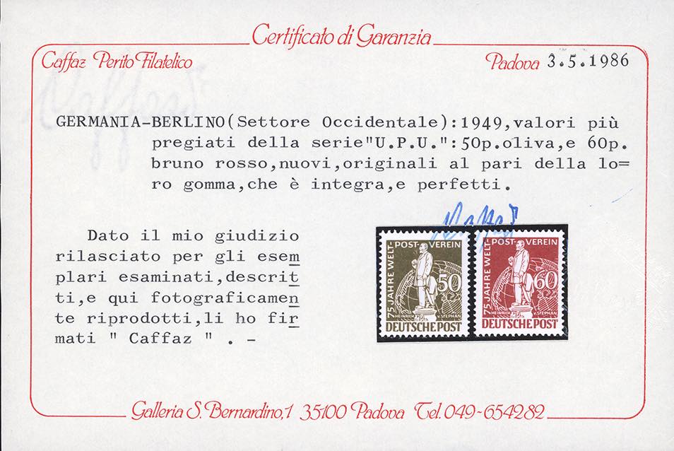 GERMANIA BERLINO 1949 - UPU, serie completa (21/27), gomma originale integra, perfetti. Molto freschi. Cert. Caffaz per i n. 24/25. Ex coll. Romano.