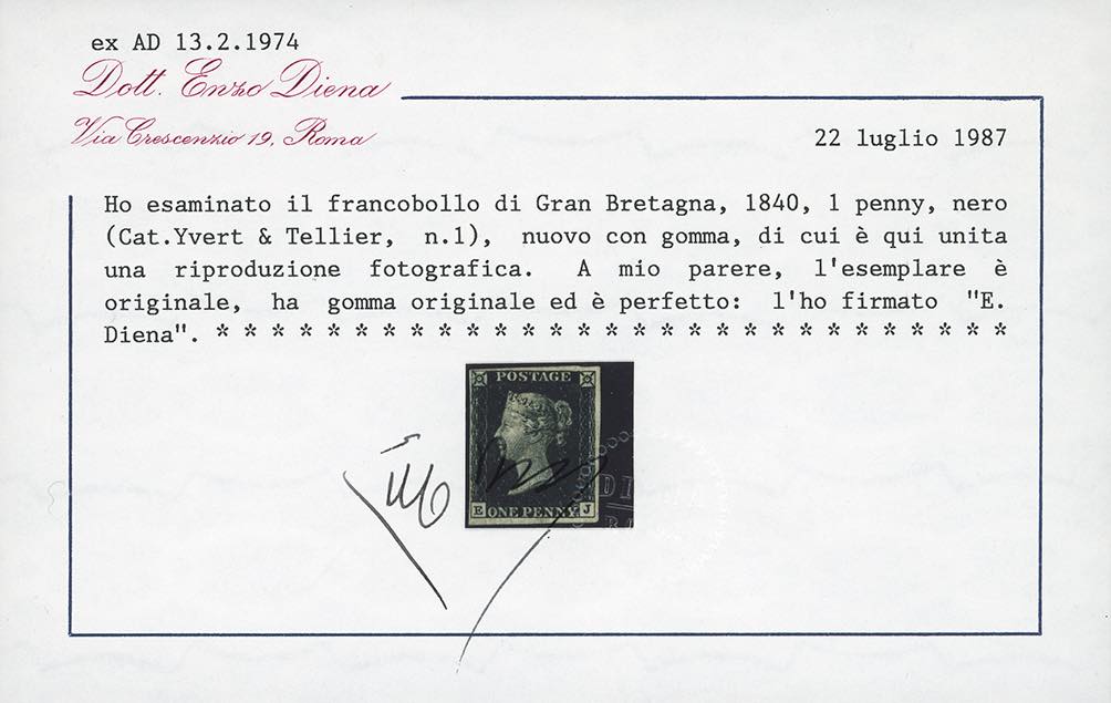 GRAN BRETAGNA 1840 - 1 p. Penny black (1), nuovo, gomma originale, perfetto. Molto fresco e ben marginato. Il primo francobollo emesso al mondo, in ottimo stato di conservazione. Cert. A.Diena ed Enzo Diena 1987.