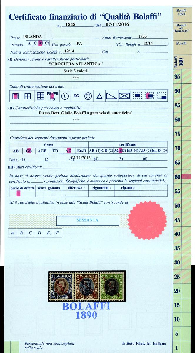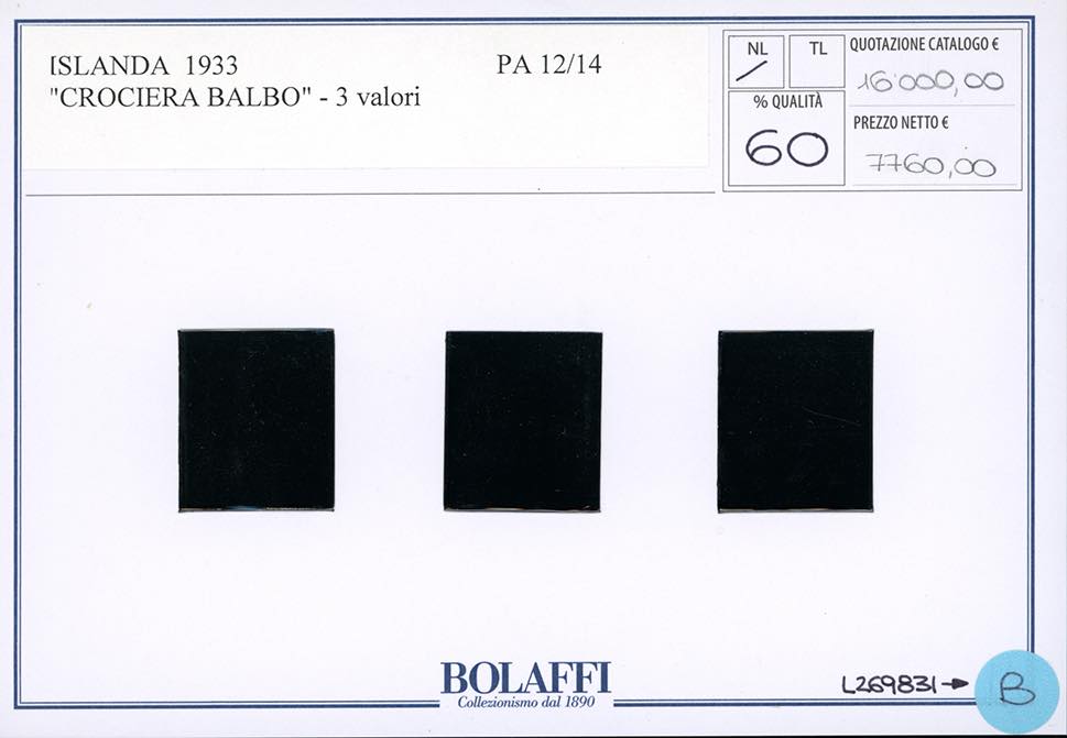 ISLANDA POSTA AEREA 1933 - Soprastampati Crociera Nord Atlantica di Balbo, serie completa (A12/A14), nuovi, gomma originale integra, perfetti. Ottima qualità. A.Diena, G.Bolaffi, Brun, cert. Finanziario Bolaffi.