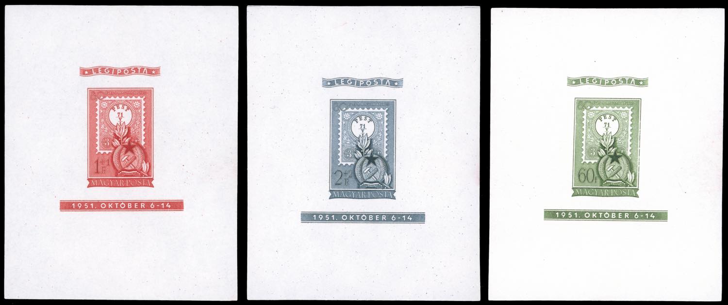 UNGHERIA FOGLIETTI 1951 - Tre foglietti 80° anniversario francobollo ungherese, non dentellati (Yv.26/28), gomma originale, lievissima traccia di linguella, perfetti e molto freschi.