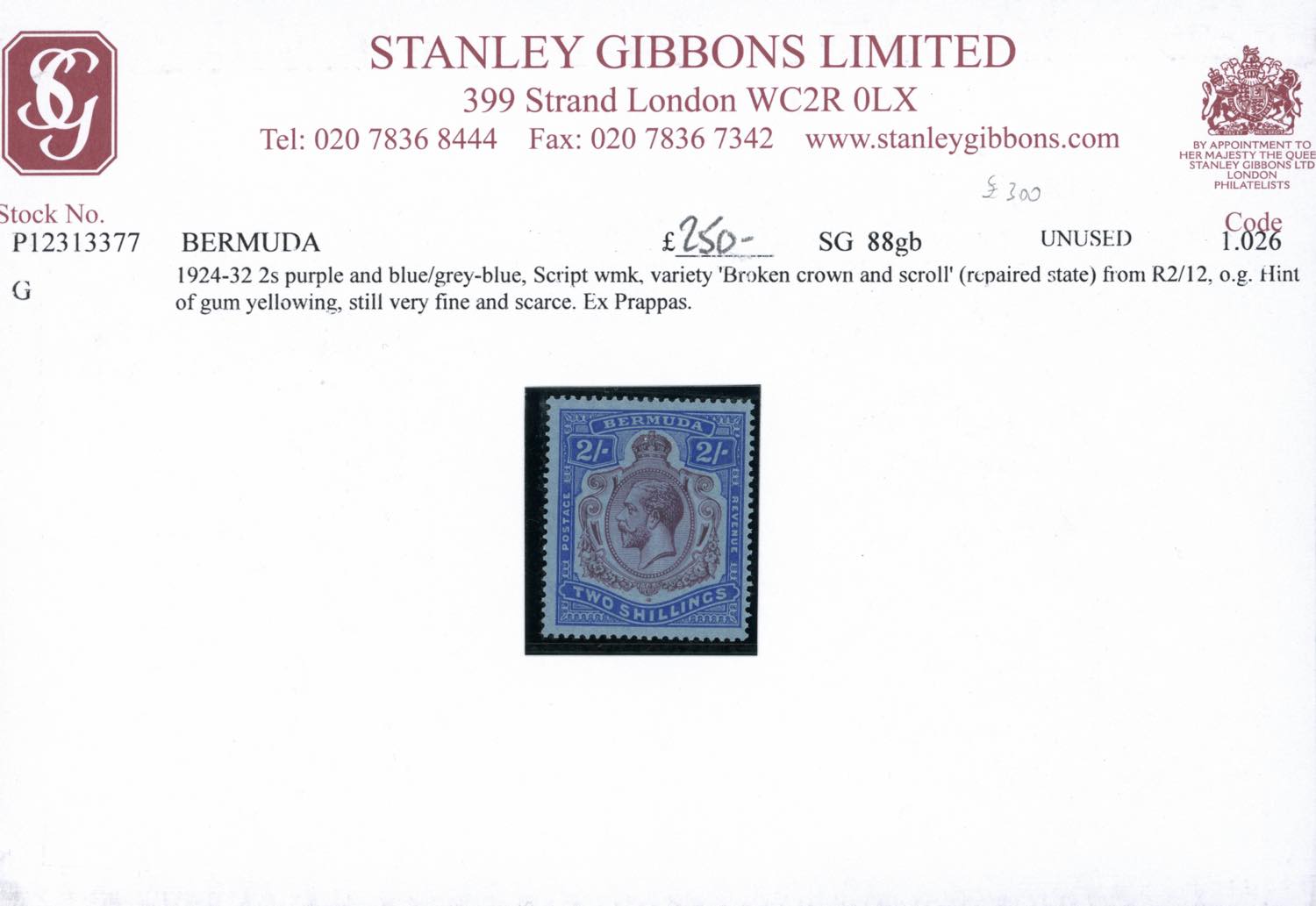 BRITISH COLONIES-BERMUDA 1924/32 - 2 s. purple and blu/grey blu Giorgio V, varietà "Broken crown and scroll" (SG.88gb), gomma originale, MLH, perfetto e molto fresco.