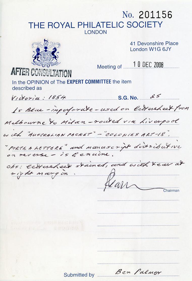 BRITISH COLONIES-VICTORIA AUSTRALIA 1856 - Double-rate letter (1/2-1 ounce) from Melbourne to Milan, 1 s (Yv. 7) lightly short on the left, only to the U.K. then considered unpaid. The letter was carried by the clipper Joseph Tarrat of the Black Ball line from Port Philip, via Cape Horn, to England. In London the red boxed handstamp "COLONIES/ART-18" was struck, referring to the article of the Anglo-French Convention debiting France 3 s 4 d for each 30 grams of letters carried to France. Since the letter exceeded 15 grams of weight, the French debit amounted to 51 decimes (3x17 decimes), corresponding to 6 Astrian lire. The addresses was also charged the Austrian inland rate of 3 krCM for a letter weighing less than a Weiner Lot (17.5 grams) and a destination under 75 km distant from the Austro-Sardinian border. The only recorded letter from Victoria to Lombardy Venetia that carries Victorian postage stamps. Cert. R.P.S. (ex coll.Mentaschi).
