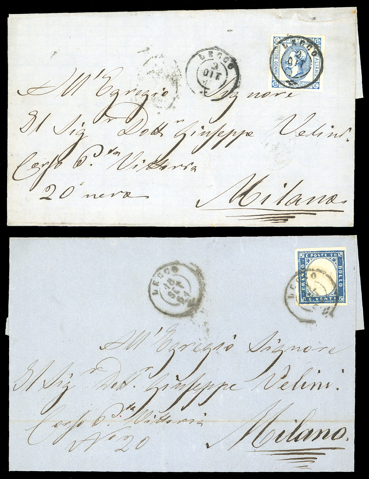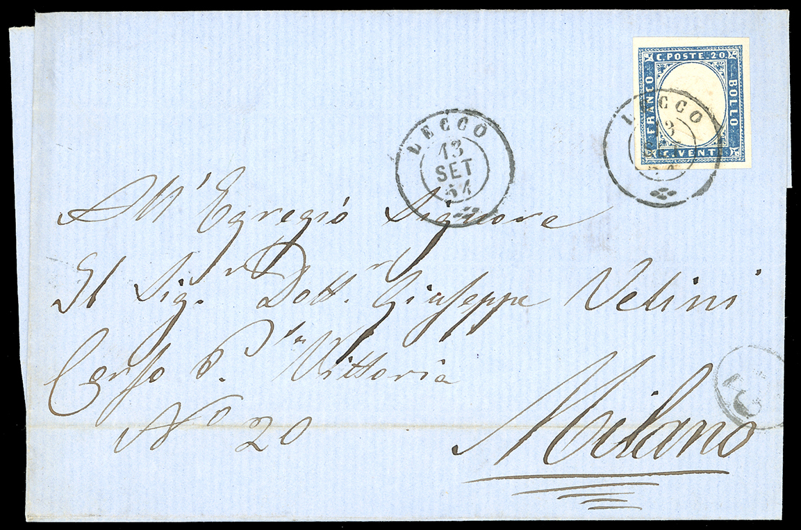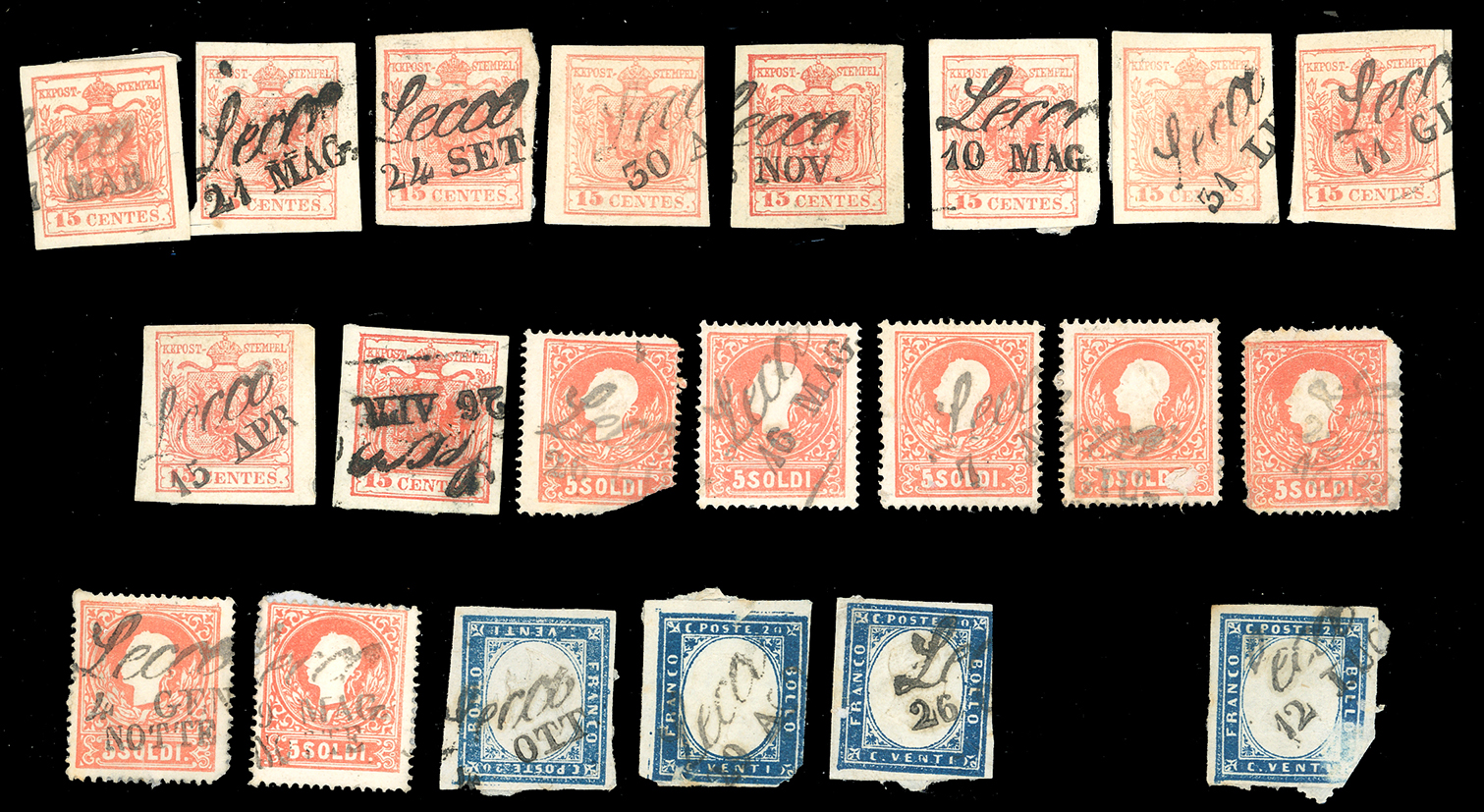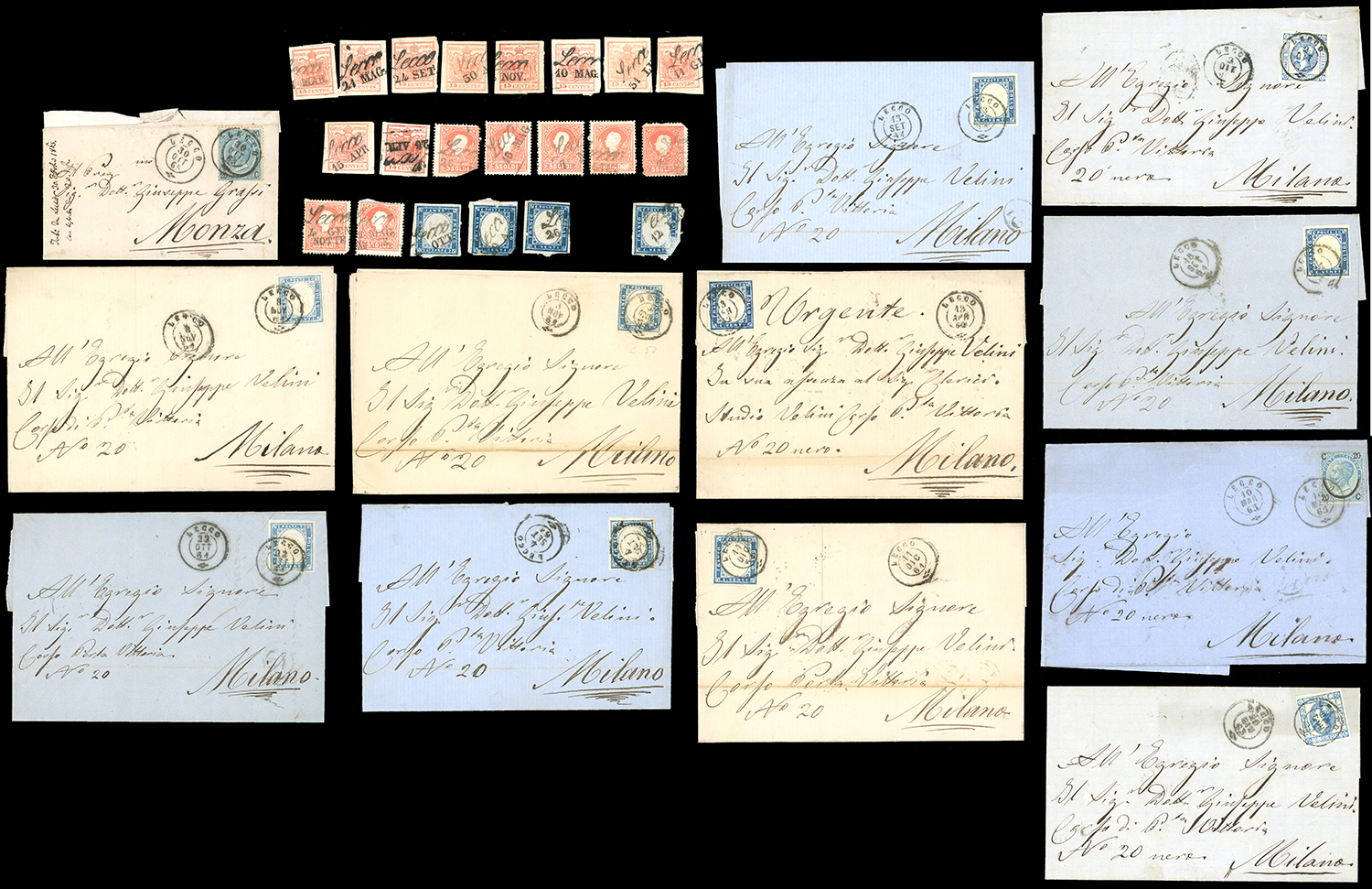 LOMBARDO VENETO/REGNO D'ITALIA 1850/1865 - Bell'insieme di francobolli sciolti e lettere affrancate, tutte con annulli di Lecco. Qualità mista, per specialista.