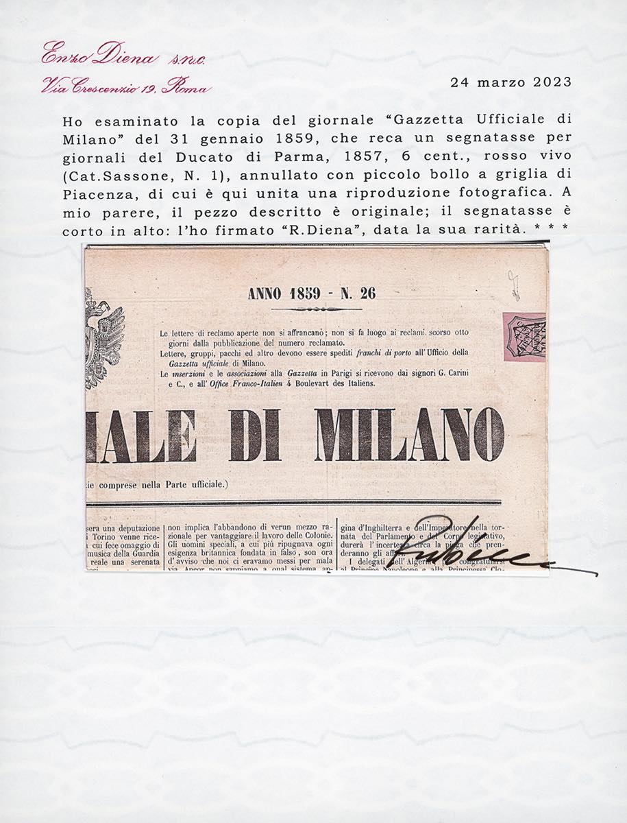 PARMA 1852/1859 - Cinque lettere e due giornali con affrancature del periodo. Notate alcune buone/ottime presenze e due certificati Diena. ... Leggi tutto