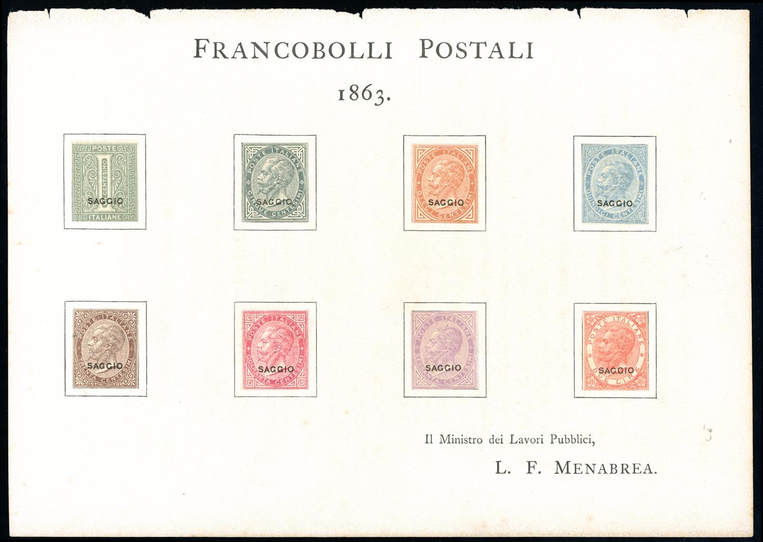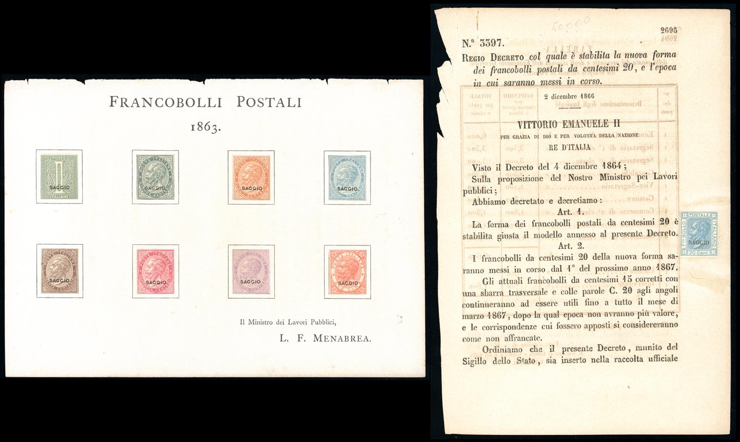 REGNO D'ITALIA 1863/1866 - Foglietto Menabria, con i valori De La Rue non dentellati e soprastampati "saggio", e Decreto di emissione del ... Leggi tutto