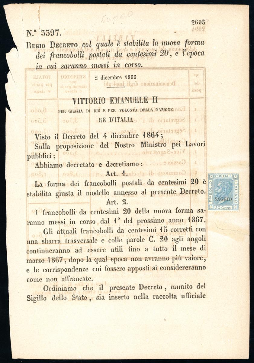 REGNO D'ITALIA 1863/1866 - Foglietto Menabria, con i valori De La Rue non dentellati e soprastampati "saggio", e Decreto di emissione del 20 cent. azzuro (26), soprastampato "saggio". Da esaminare.