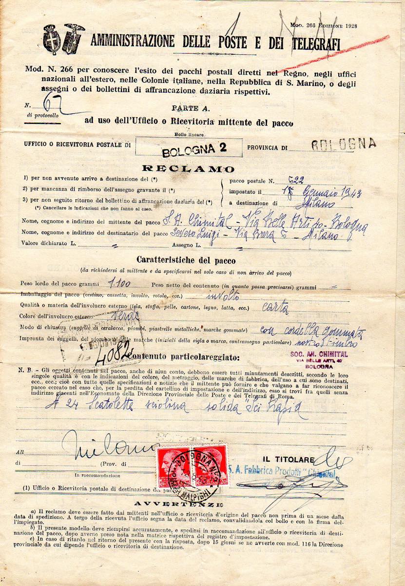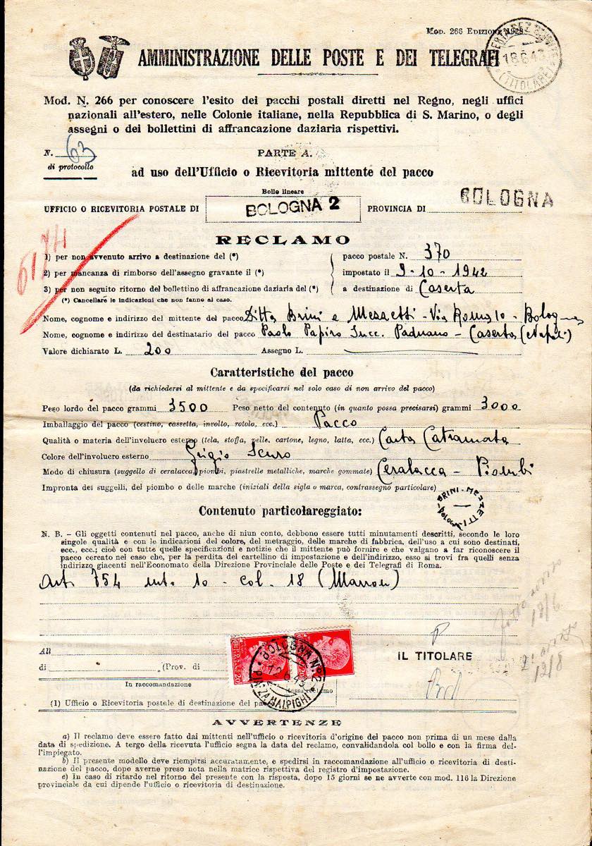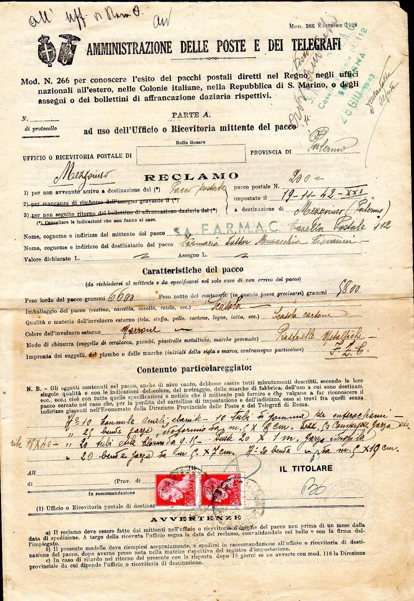 Lotto 2560 - REGNO D'ITALIA 1943 - Quattordici moduli di reclami ...