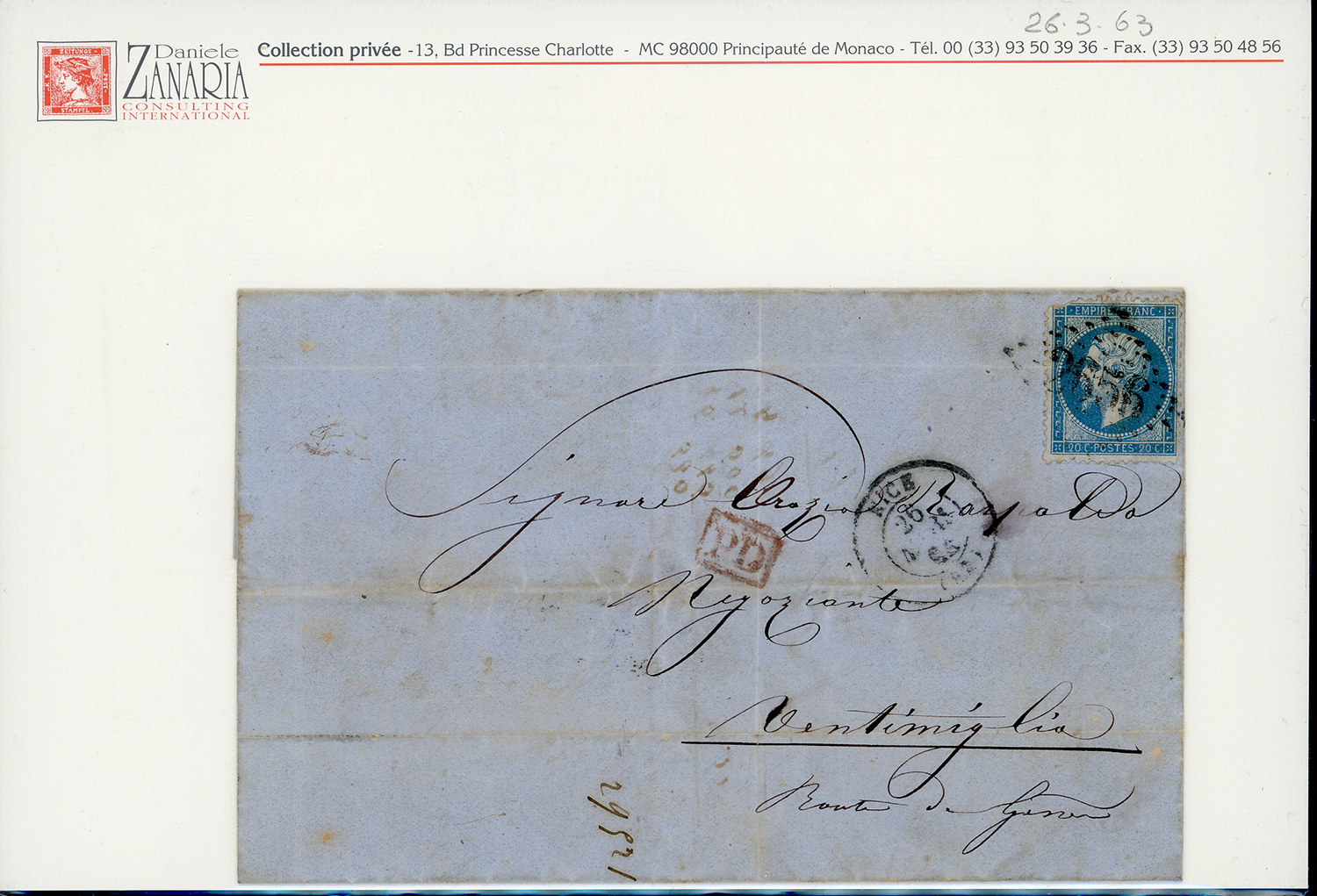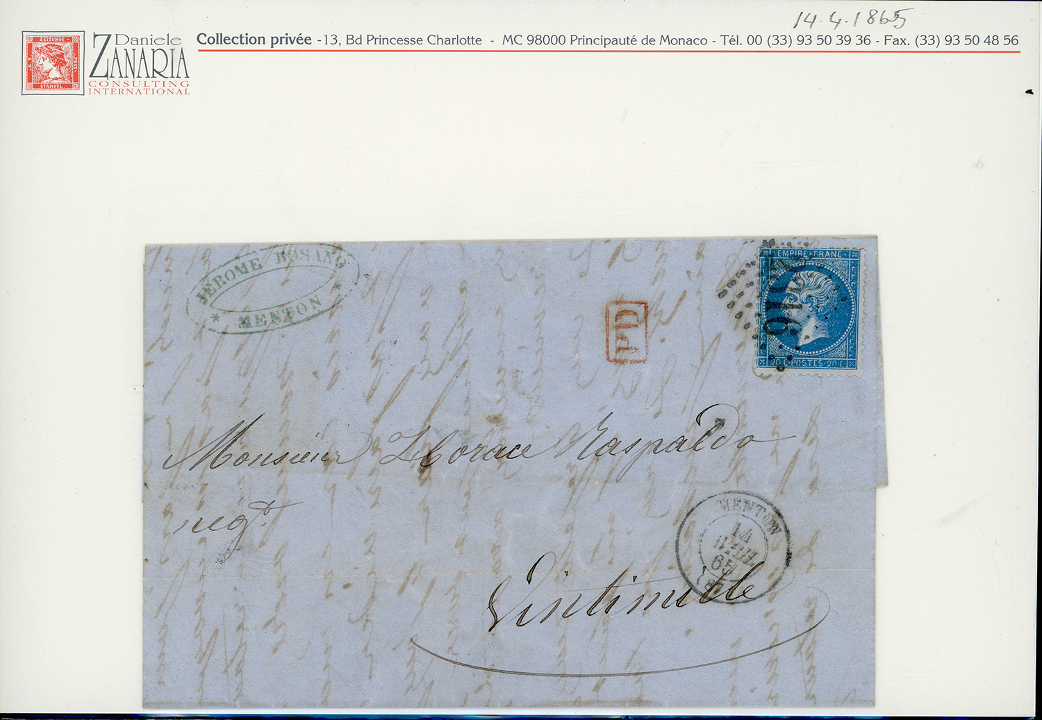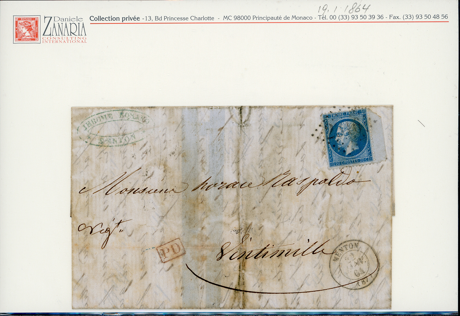 REGNO D'ITALIA INCOMING MAIL 1864/1867 - Cinque lettere affrancate con 20 cent. Napoleone (Francia n.22), quattro perfetti e uno leggermente difettoso, da Mentone a Ventimiglia, in tariffa di raggio limitrofo. Non comuni.