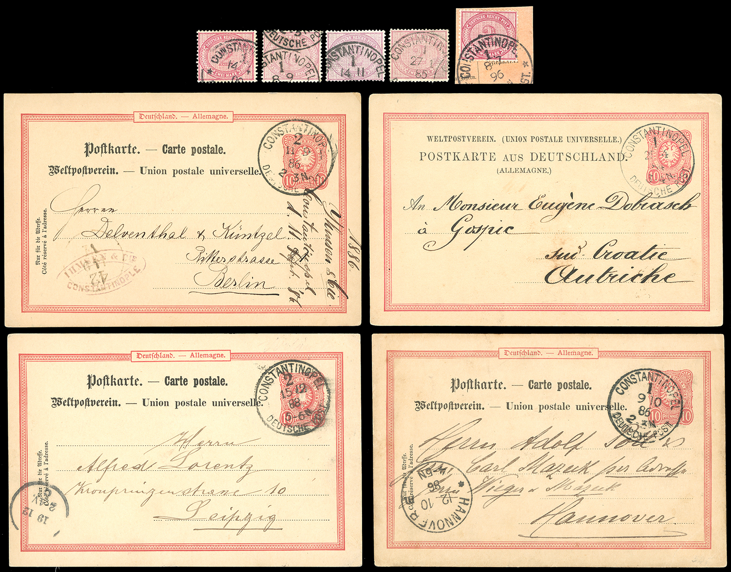 GERMANIA LEVANTE 1884/1896 - Quattro cartoline postali e cinque francobolli da 2 m., tutti con annulli dell'ufficio tedesco di Costantinopoli. Pregevole insieme.