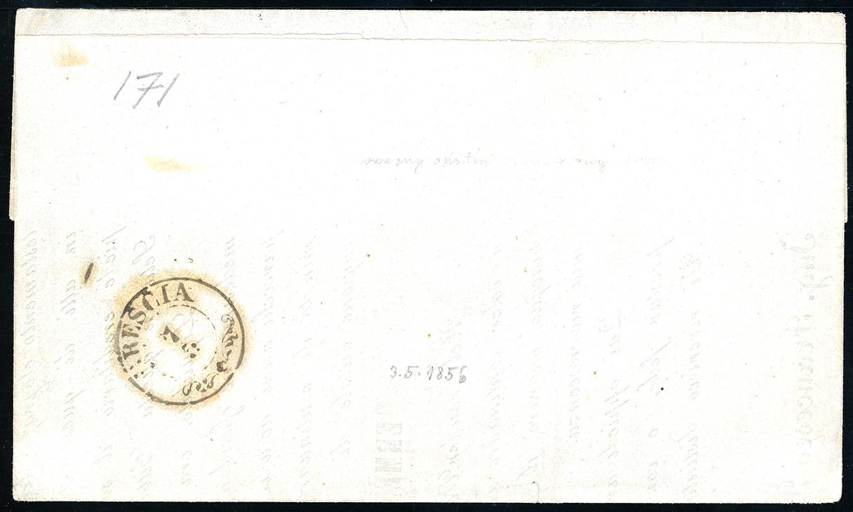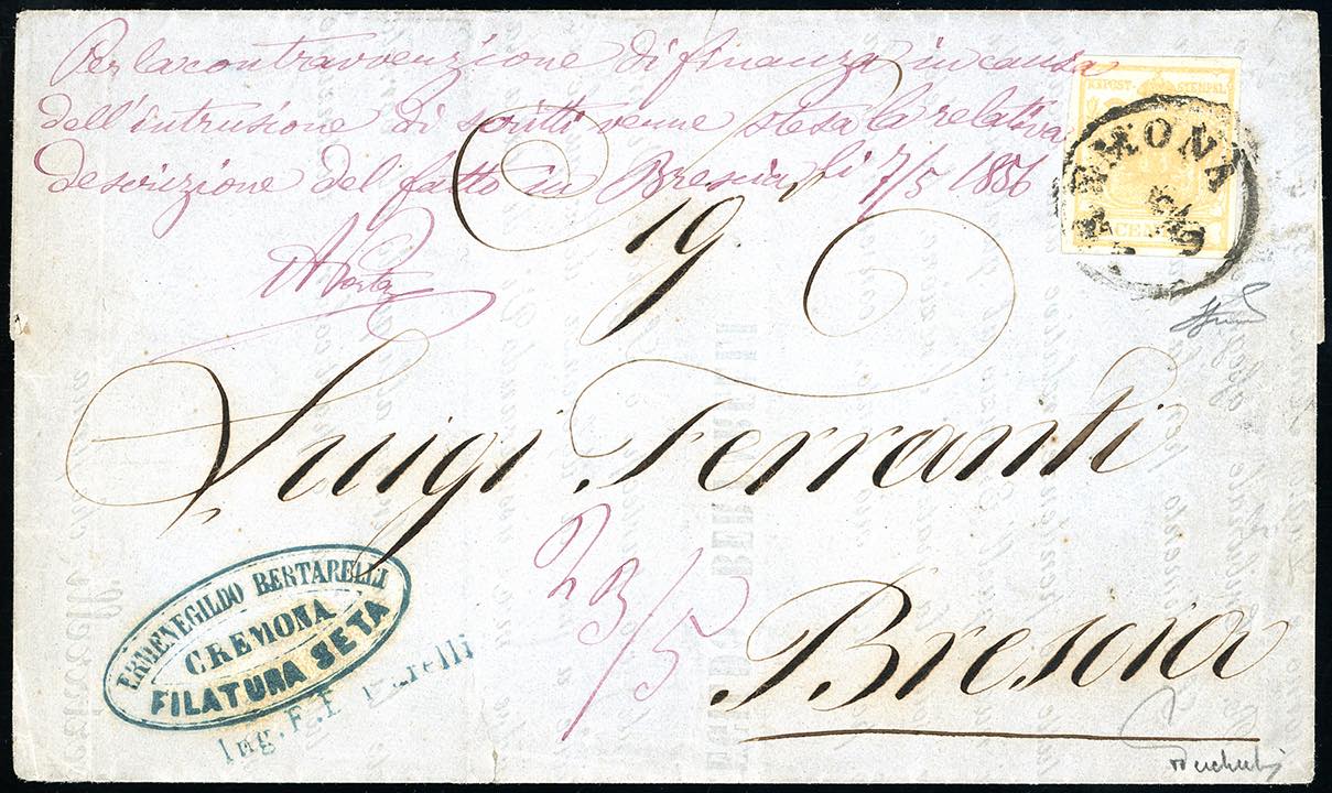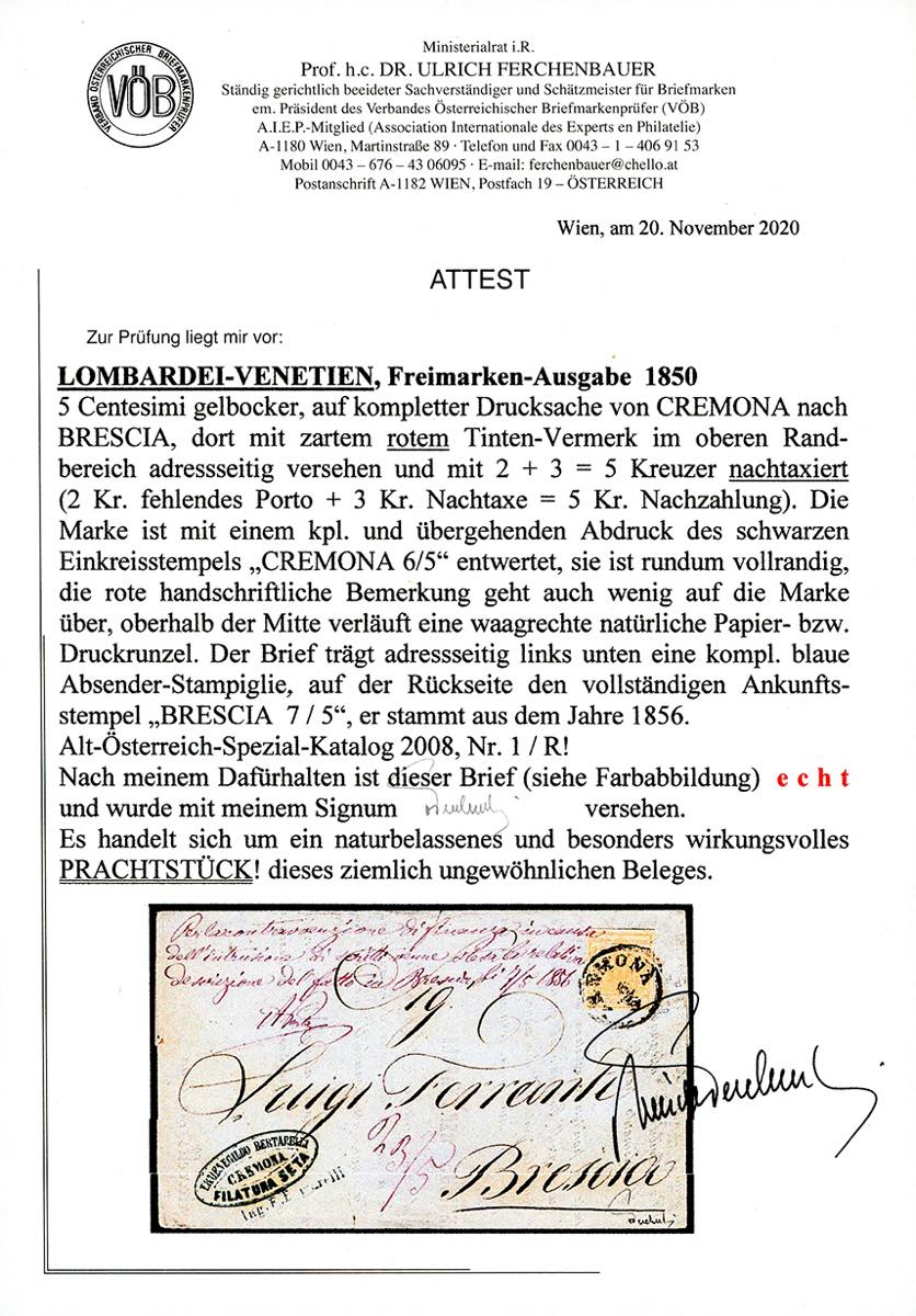 1856 - 5 cent. giallo ocra (1), perfetto, isolato su circolare a stampa a Cremona 6/5/1856 a Brescia. Sul fronte manoscritto "Per la contravvenzione di finanza in causa dell'intrusione di scritti venne stesa la descrizione del fatto in Brescia" e la lettera venne tassata 5 carantani: 2 kr. per il porto mancante, 3 kr. di soprattassa. Estremamente rari gli stampati tassati per il contenuto non ammesso. Da esposizione! Ferrario cert. Ferchenbauer.