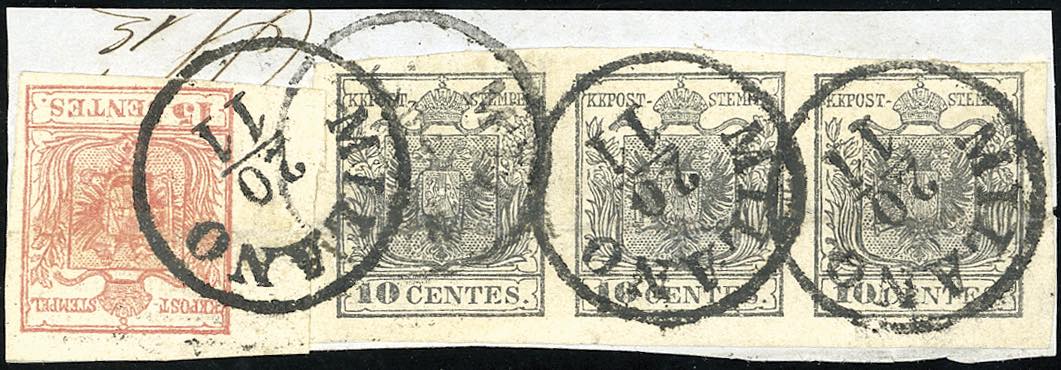 1850 - 10 cent. nero, striscia orizzontale di tre esemplari con l'ultimo ritoccato, dicitura "CENTES" rifatta e 15 cent. rosso (2,2k,6), tutti perfetti, su frammento usato a Milano. Insieme splendido e rarissimo! Si conosce solo una striscia analoga su busta, quotata € 35.000 dal Sassone. Cert. Ferrario.
