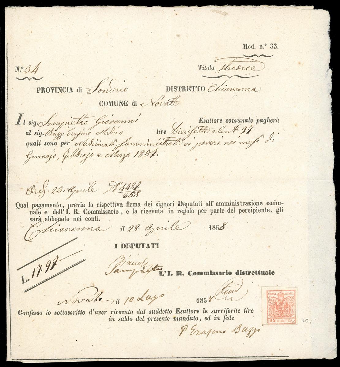 1856/58 - 15 cent. rosso vermiglio, carta a macchina (20), due esemplari in uso fiscale, uno annullato, l'altro no, su altrettanti mandati ... Leggi tutto