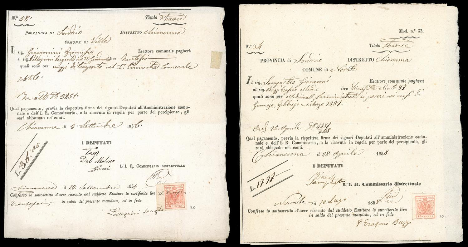 1856/58 - 15 cent. rosso vermiglio, carta a macchina (20), due esemplari in uso fiscale, uno annullato, l'altro no, su altrettanti mandati di pagamento. Non comuni.