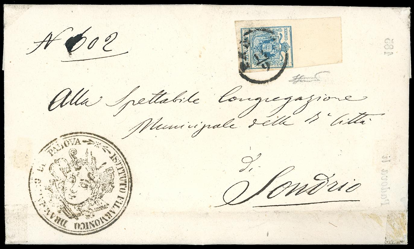 1856 - 45 cent. azzurro, III tipo, carta a mancchina (22), ampio bordo di foglio in alto (21 mm.), perfetto, su lettera da Padova ... Leggi tutto