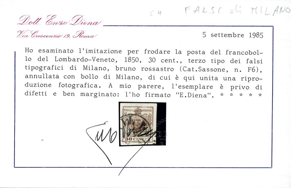 1858 - 30 cent. bruno rossastro, falso per posta di Milano, III tipo (F6), perfetto e ben marginato, usato. Molto bello. G.Bolaffi, Em.Diena, cert. E.Diena.