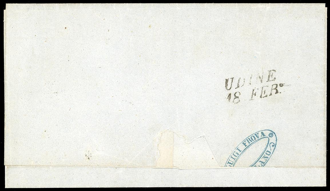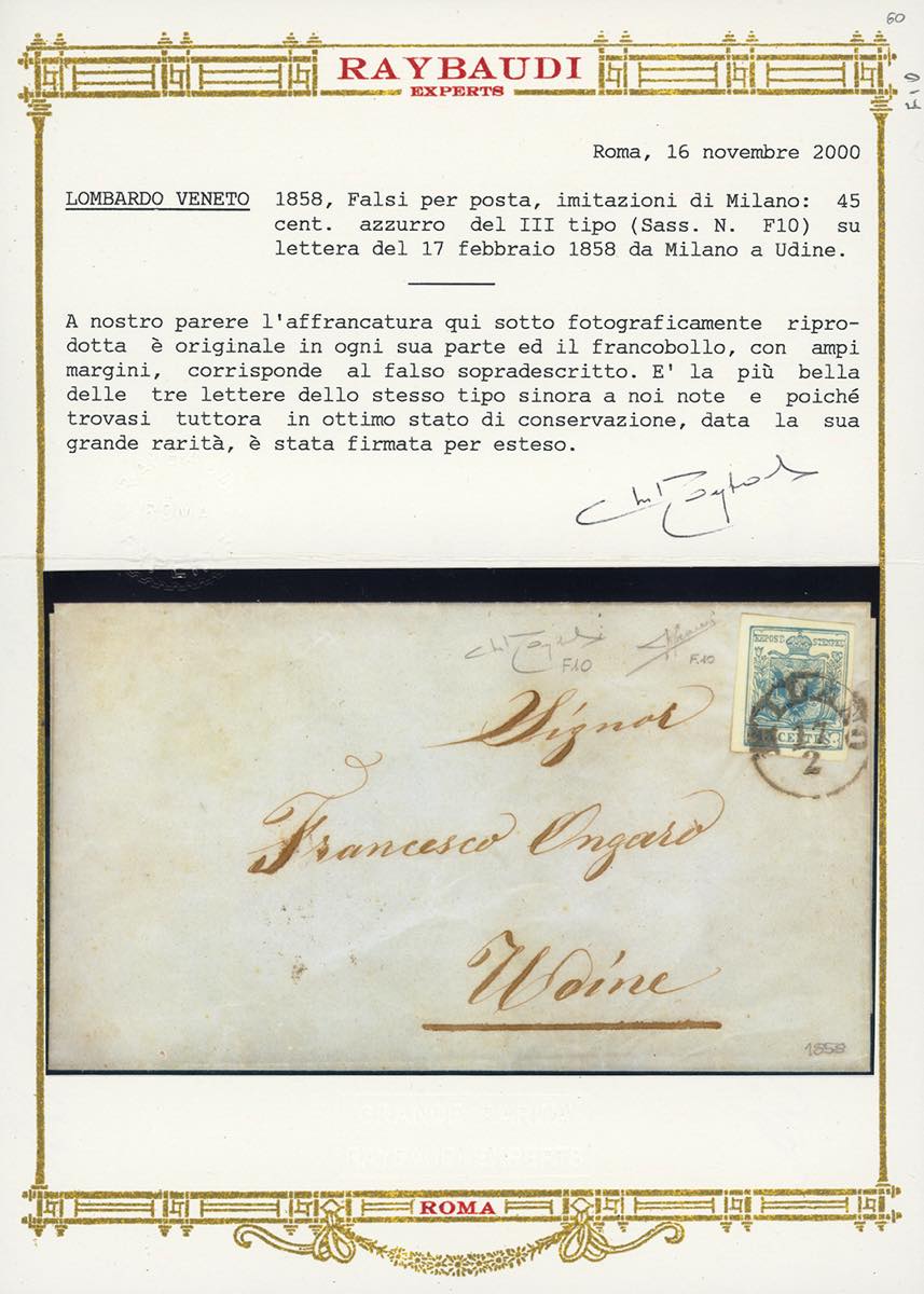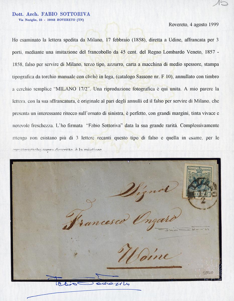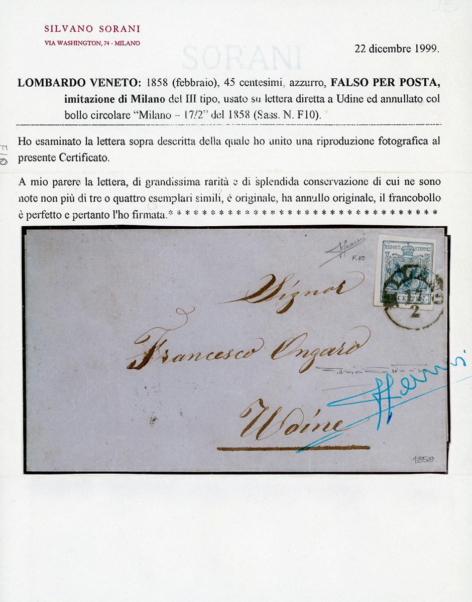 1858 - 45 cent. azzurro, falso per posta di Milano, III tipo (F10), perfetto e ben marginato, su lettera da Milano 17/2/1858 ad Udine. Delle tre lettere note affrancate con questo falso, questa è qualitativamente la migliore. Importante rarità del Lombardo Veneto, da esposizione. Cert. Sorani e Oro Raybaudi.