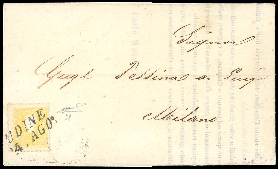 1860 - 2 soldi giallo, II tipo (28), isolato su circolare da Udine 4/8/1860 a Milano. Ferrario.