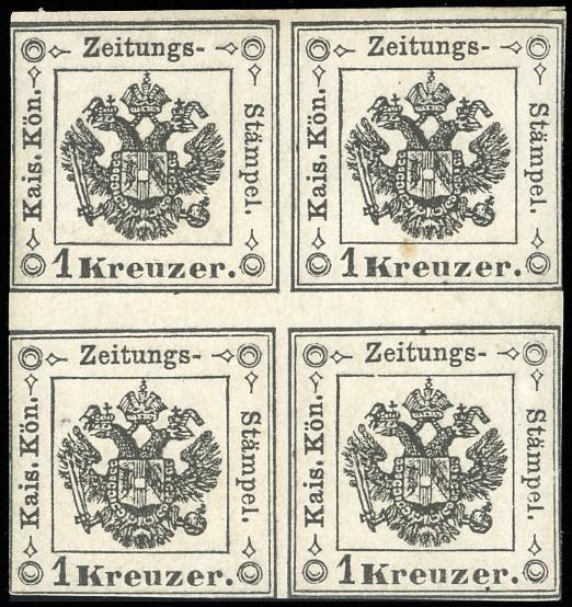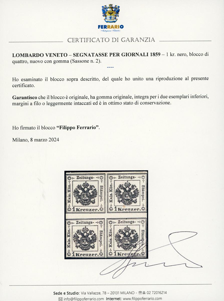 1859 - 1 kr. nero (2) blocco di quattro, gomma originale, integra per i due esemplari inferiori, margini a filo o leggermente intaccati. Raro e molto fresco. Cert. Ferrario.