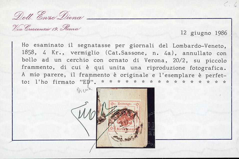 1858 - 4 kr. vermiglio (4a), perfetto, usato su frammento a Verona 20/2. Raro e molto bello. Cert. E.Diena.