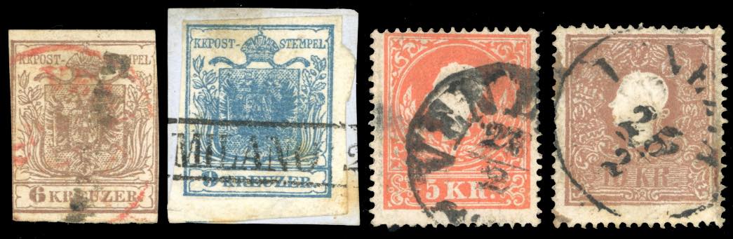 1850/59 - Quattro francobolli della I e della II emissione di Austria, tutti con annulli del Lombardo Veneto. Notato Venezia C1 in rosso coannullatore.