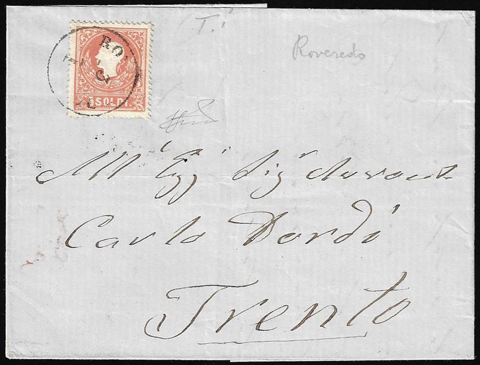 1859 - 5 soldi rosso, I tipo (25), perfetto, su lettera da Roveredo 3/1/1859 a Trento. Non comune uso della II emissione in Austria. Ferrario.