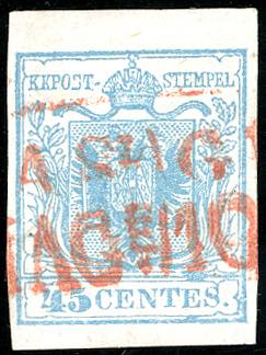 CASALMAGGIORE, Rd rosso punti R3 - 45 cent. (10n), perfetto, usato con il bollo in inchiostro rosso. Molto raro, specie su questo valore. Cert. Ferchenbauer.