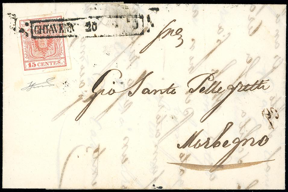 CHIAVENNA, R50 punti 12 - 15 cent. rosso, I tiratura (3a), perfetto, su lettera del 20/9/1850 per Morbegno. Pregevole annullamento.