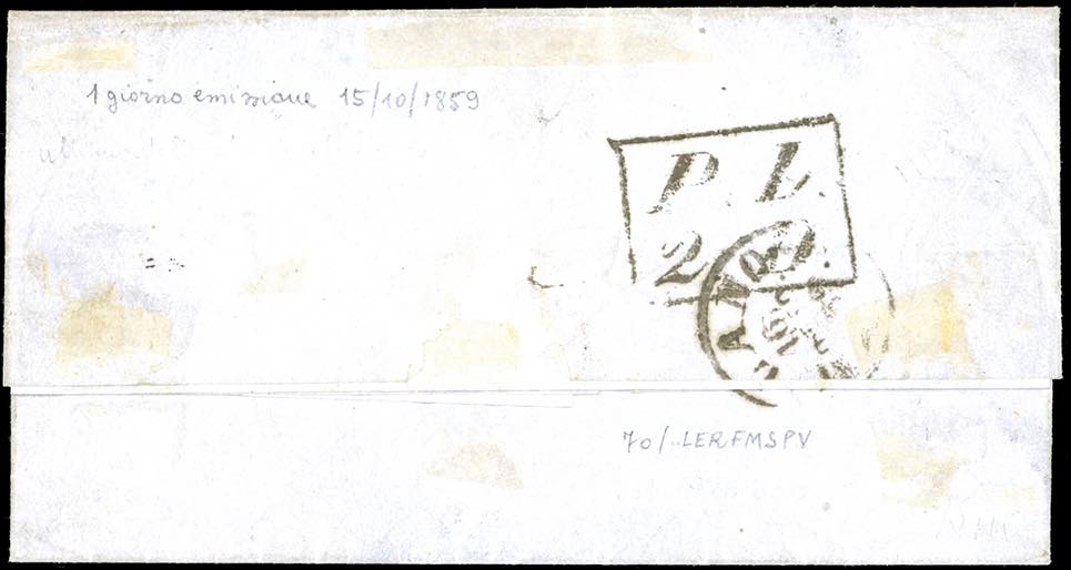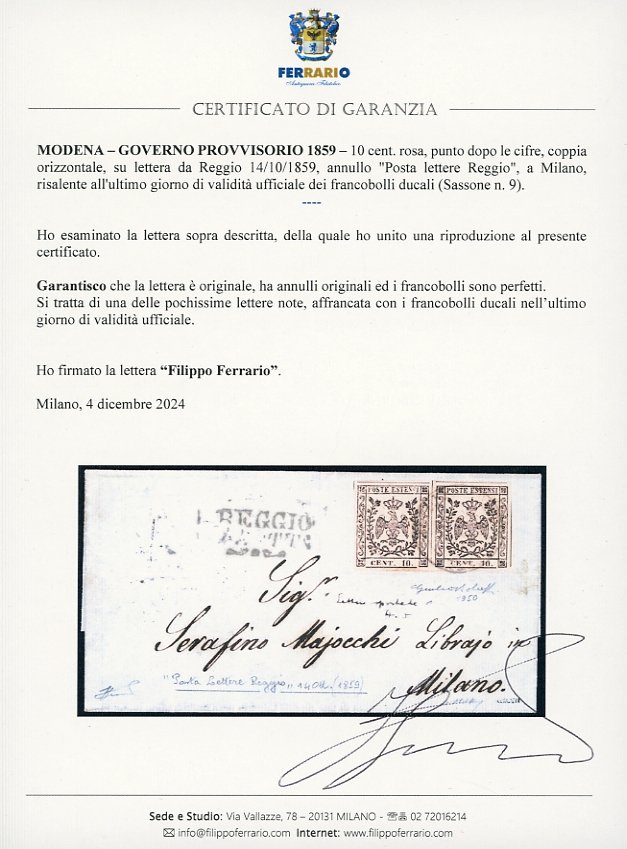 1859 - 10 cent. rosa, punto dopo le cifre (9), coppia orizzontale, perfetta e ben marginata, su lettera da Reggio 14/10/1859, annullo "Posta lettere Reggio", a Milano. Splendida e rara lettera risalente all'ULTIMO GIORNO DI VALIDITA' UFFICIALE dei francobolli ducali. Per collezionista raffinato. Giulio Bolaffi per esteso, A.Bolaffi, cert, Ferrario.