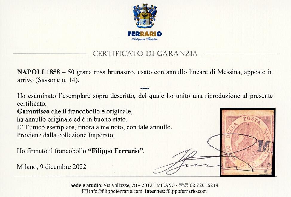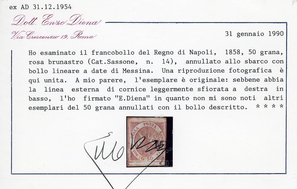 1858 - 50 grana rosa brunastro (14), ottimo stato, eccezionalmente usato con parte del bollo lineare di Messina, come unico annullatore. E' l'UNICO ESEMPLARE NOTO. A.Diena, Chiavarello, cert. Enzo Diena per esteso, Ferrario. Ex collez. Imperato.