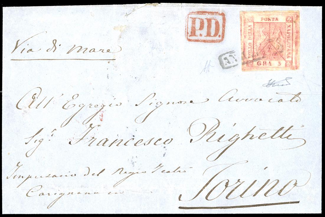 1860 - 5 grana carminio rosa, II tavola (9), perfetto e con margini eccezionali, su lettera da Napoli 11/12/1860 a Torino, bollo PD in ... Leggi tutto