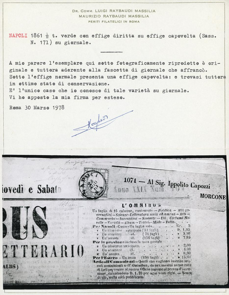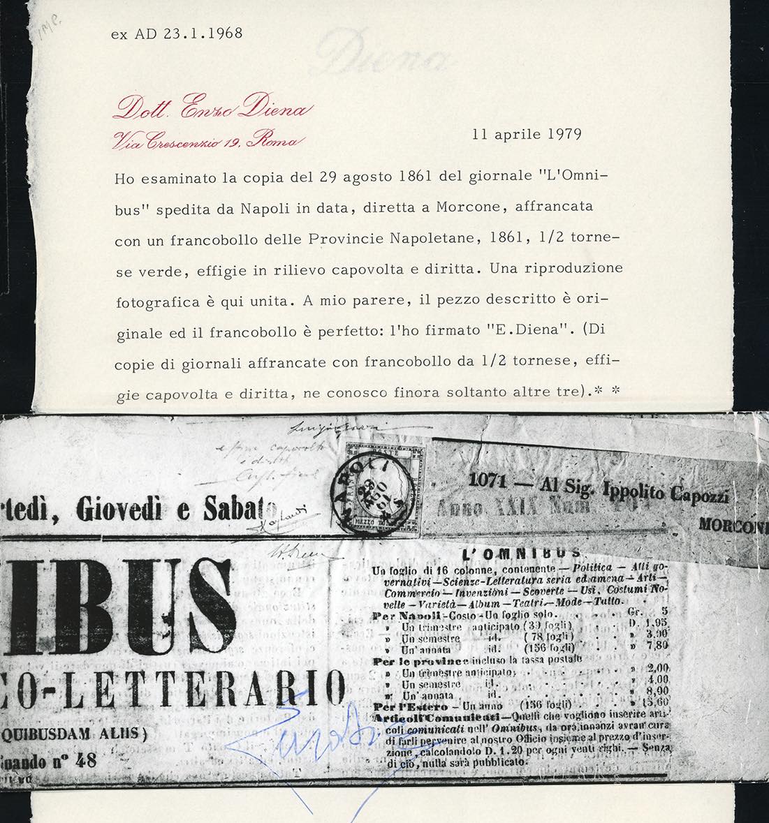 1861 - 1/2 tornese verde, EFFIGIE CAPOVOLTA E DIRITTA (17), perfetto, isolato su giornale completo di fascetta da Napoli 28/8/1861 a Morcone. Splendida varietà di cui sono finora noti solo quattro casi. Rarità del settore. Chiavarello, Fiecchi e Alberto Diena per esteso, Ferrario, cert. Raybaudi ed Enzo Diena. Ex collezione Imperato.