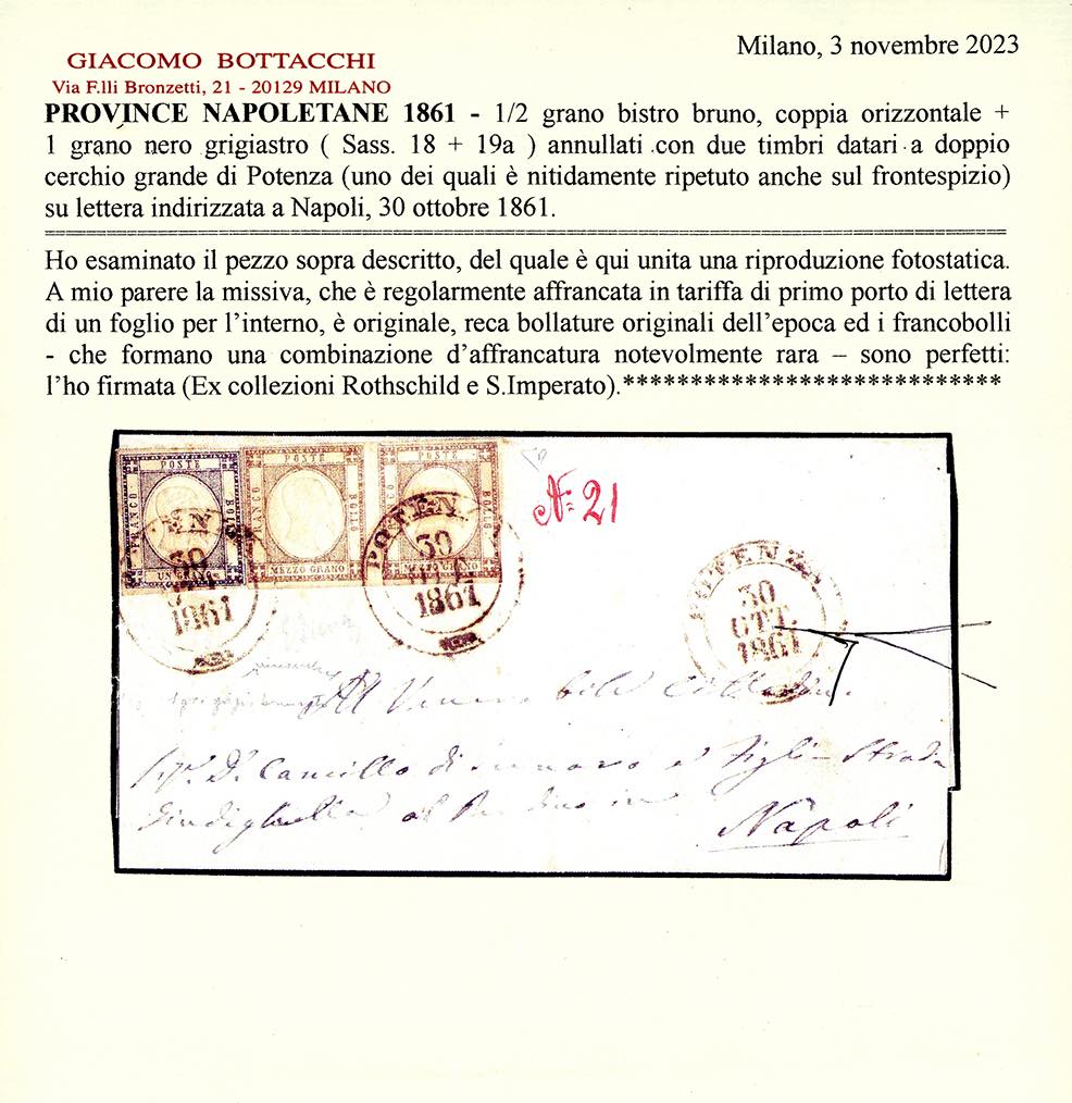 1861 - 1/2 grano bistro bruno, coppia, 1 grano grigio nero (18,19a), perfetti, su lettera da Potenza 30/10/1861 a Napoli. Rara affrancatura bicolore. Em. Ed e.Diena, Chiavarello, cert. Bottacchi. Ex coll. Rothschild e Imperato.