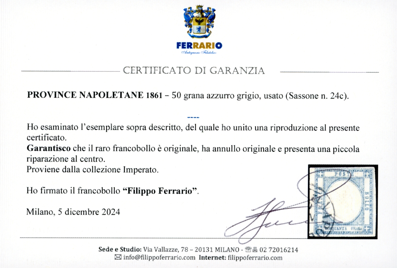 1861 - 50 grana azzurro grigio (24c), usato, piccola riparazione al centro, ottimo aspetto. A.Diena, cert. Ferrario. Ex coll. Imperato.