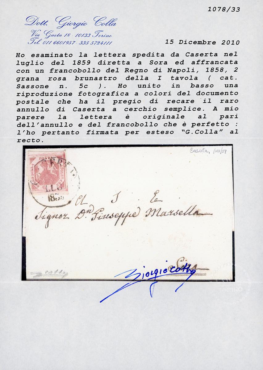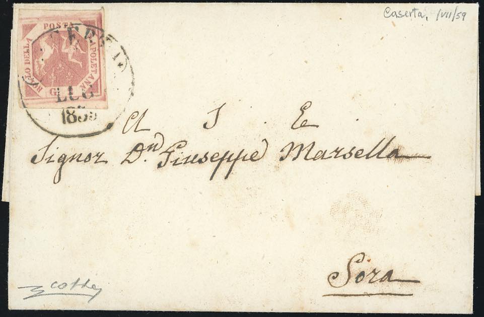 CASERTA, cerchio punti R2 - 2 grana rosa brunastro I tavola (5c), perfetto, su sovracoperta di lettera del luglio 1859 per Sora. Molto rara! Cert. Colla.