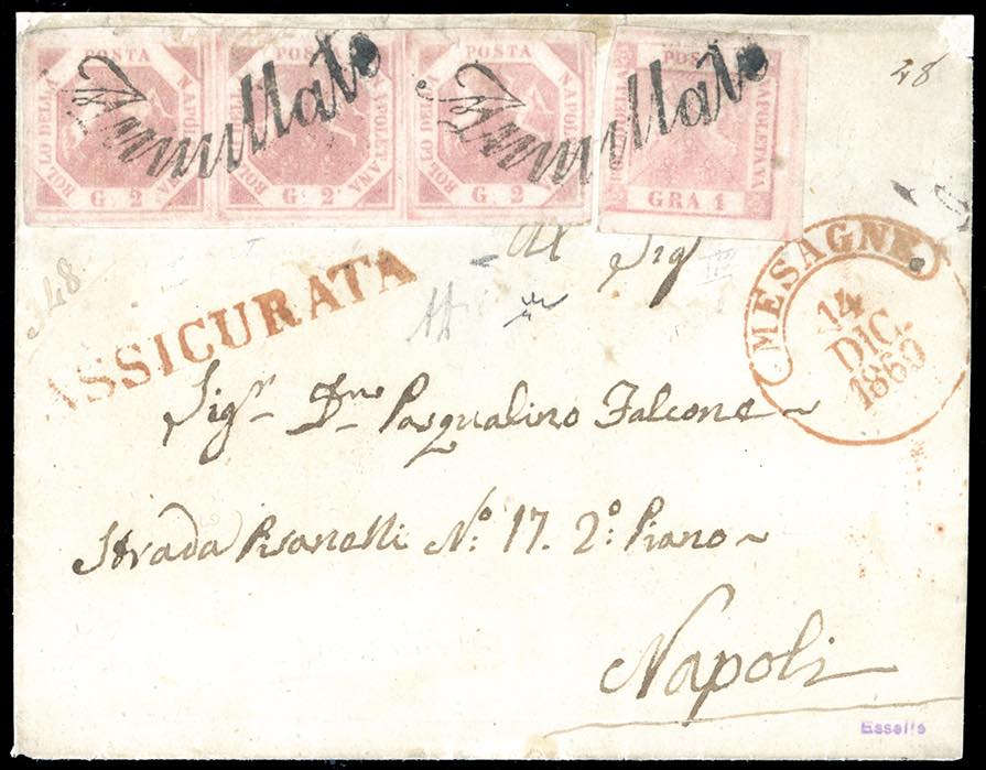 MESAGNE, svolazzo + cerchio in rosso punti 12 - 1 grano, 2 grana, striscia di tre (4,5), ottimo stato, su lettera parzialmente incompleta al verso del 14/12/1860 per Napoli, bollo di arrivo al verso, lineare "assicurata" in rosso sul fronte. Pregevole insieme. A.Diena, Chiavarello. Ex coll. Imperato.