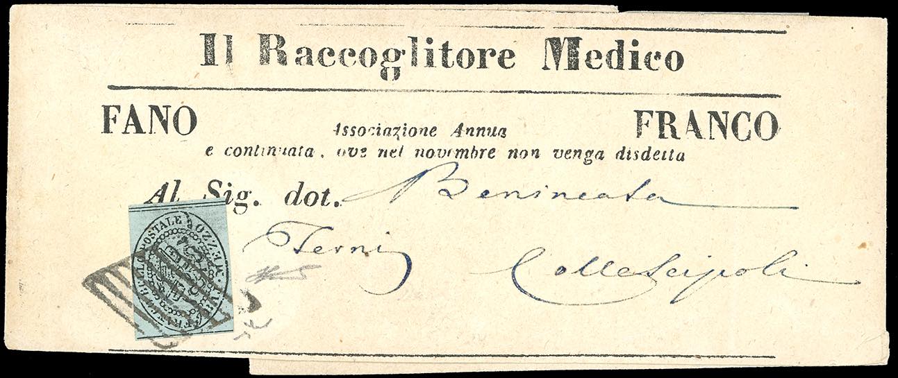 1852 - 1/2 baj grigio azzurro (1a), giusto in alto, isolato su fresca fascetta di stampato da Fano a Terni. Chiavarello, Ferrario. Ex coll. Imperato.